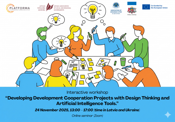 At the event, the participants will learn about the priorities of Latvia’s development cooperation policy and the sustainable development priorities of Ukrainian municipalities, but will also participate in a workshop led by experienced lecturer and communications practitioner getting introduced with the design thinking method and encouraging to create the most sustainable and successful development cooperation project ideas, combining analytical thinking, empathy and creativity.